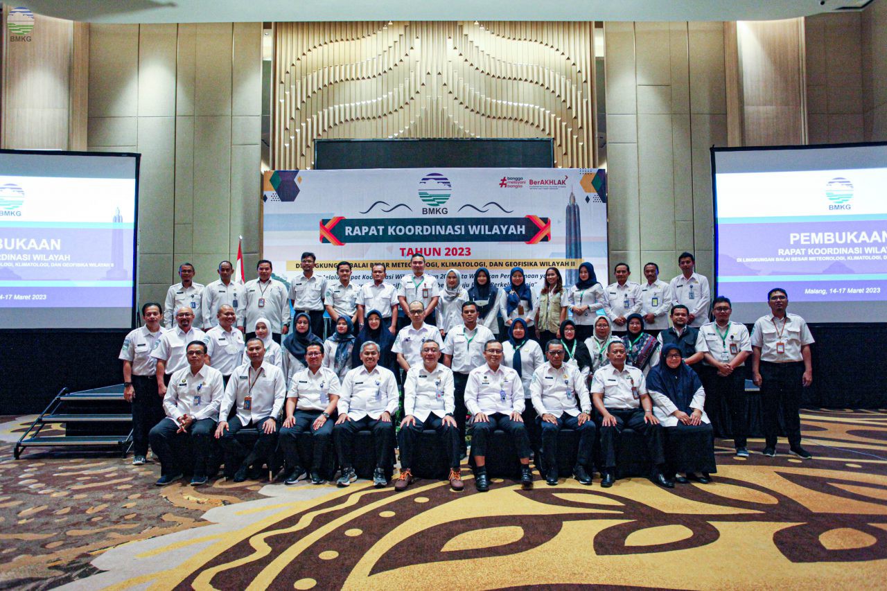 Kegiatan Rapat Koordinasi Wilayah BMKG Tahun 2023 di lingkungan Balai Besar BMKG Wilayah II resmi dibuka oleh Sekeretariat Utama BMKG Ir. Dwi Budi Sutrisno, M.Sc dengan mengusung tema, “Melalui Rapat Koordinasi Wilayah Tahun 2023 Kita Wujudkan Perencanaan yang Transparan, Responsif, dan Akuntabel Menuju BMKG Berkelas Dunia”. Kegiatan berlangsung selama 4 hari dari tanggal 14-17 maret 2023 di Ballroom Grand Mercure Hotel Malang.