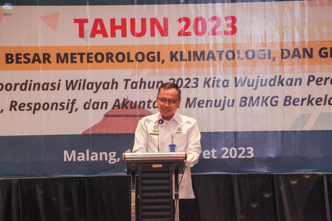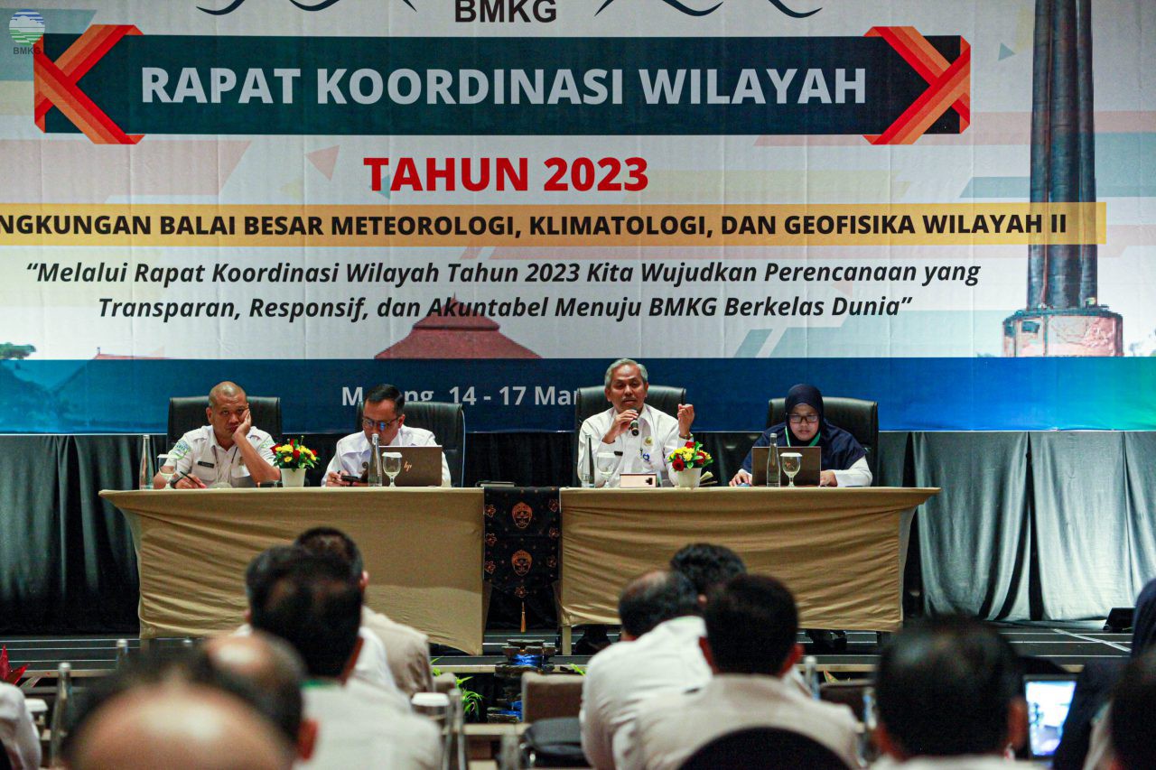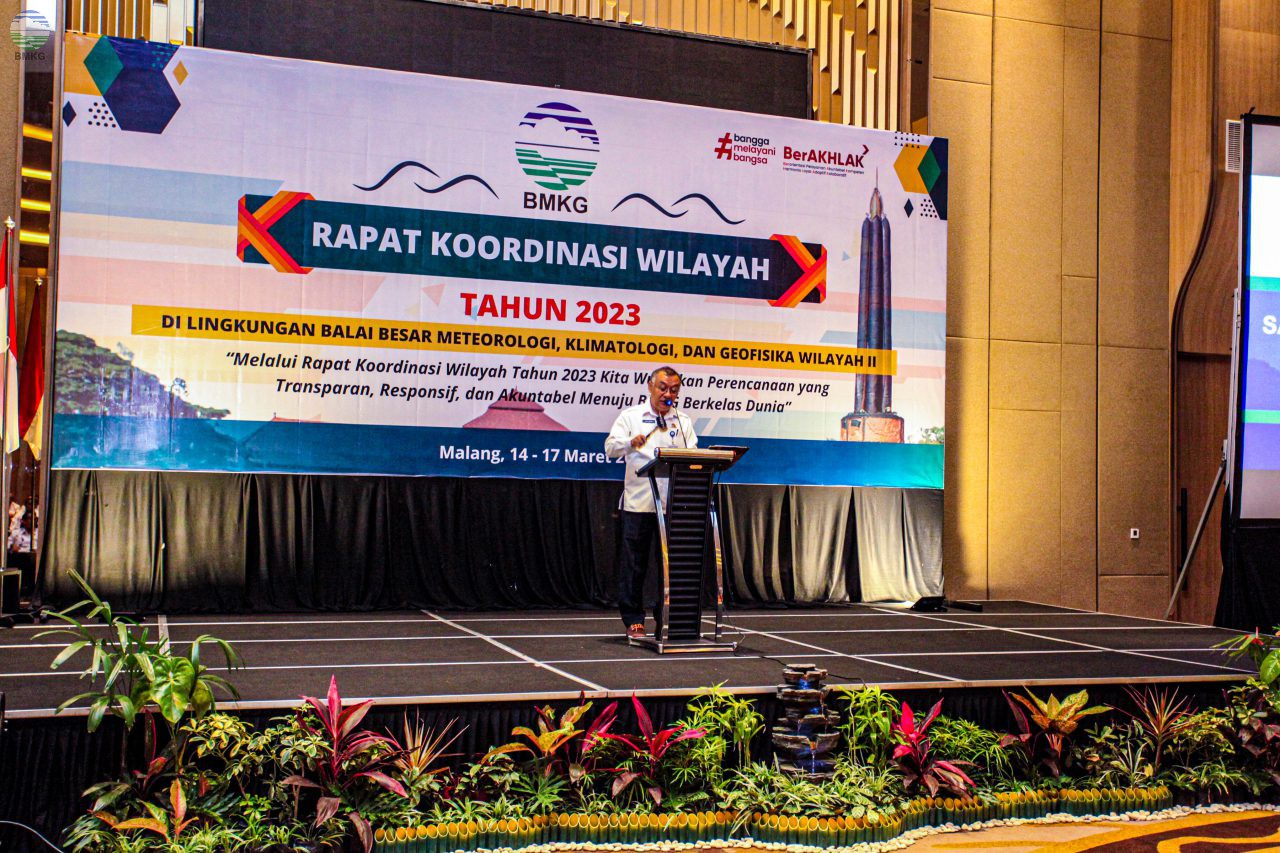 Kegiatan Rapat Koordinasi Wilayah BMKG Tahun 2023 di lingkungan Balai Besar BMKG Wilayah II resmi dibuka oleh Sekeretariat Utama BMKG Ir. Dwi Budi Sutrisno, M.Sc dengan mengusung tema, “Melalui Rapat Koordinasi Wilayah Tahun 2023 Kita Wujudkan Perencanaan yang Transparan, Responsif, dan Akuntabel Menuju BMKG Berkelas Dunia”. Kegiatan berlangsung selama 4 hari dari tanggal 14-17 maret 2023 di Ballroom Grand Mercure Hotel Malang.